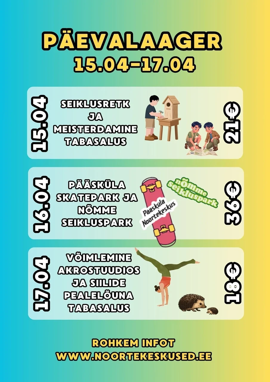 16.04, NELJAPÄEV - Pääsküla noortekeskuse skatepark ja Nõmme Seikluspark